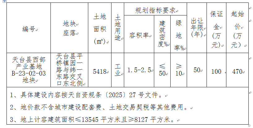 经天台县人民政府批准,天台县自然资源和规划局决定以拍卖方式出让1宗工业用地(工业“标准地”)国有建设用地使用权。现将有关事项公告如下: