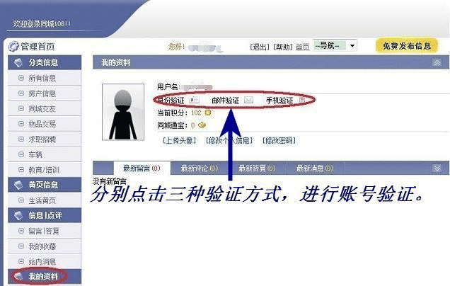 答:我们有三种验证方式——身份认证、邮箱认证、手机认证。在登录后点击“管理我的信息”进入“管理首页”,在“我的资料”中分别点击三种验证方式,进行账号验证。如图: